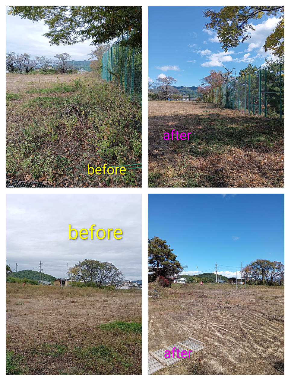 呼びかけに応じてくださった6名の有償ボランティアの方とパートナーズ理事の3名による草抜き、そして草刈り隊の猛者2名とパートナーズ理事1名による草刈り。どちらも業者にお願いしていたら時間もお金も多くかかったところ、保護者のパワーを瞬発力高く活用することができた事例となりました。